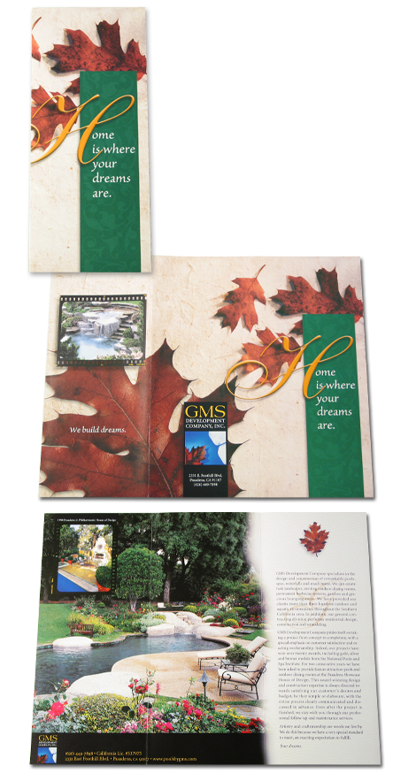 GMS Development Company, Inc. is a leading landscape architect and landscaping company in the San Gabriel Valley, specializing in natural-setting pools, spas, and living spaces, including horticulture and natural rock formations. Their primary market is individual high-end projects developed in concert with the landscape and architectural plan for new or extensively remodeled homes. GMS needed to improve their share of their highly competitive market and approached us for a small capability brochure for use at industry trade shows. Our previous work with them had developed their complete identity package. This new project highlighted the firm's design philosophy through custom photography and natural elements such as leaves and hand-made paper backgrounds. The entire effect was designed to convey the proper high-end feeling, yet warm, inviting, and natural. This project led to a related series of magazine and design showcase advertisements for GMS. Results GMs has had to increase the press run of this brochure after every show they've attended. So many are picked up, they keep running out! The strategy of specialized promotional materials and a targeted show presence has resulted in a substantial increase in new projects compared to previous years. We're very happy to have played a part in that success. |